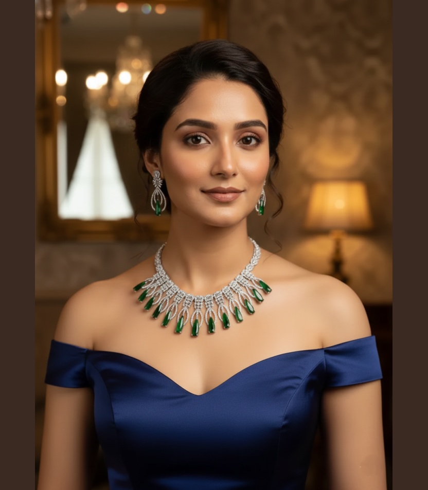 Kacper Women’s Traditional Gold Plated AD Stone Colour Green Collar Bone Necklace Set
